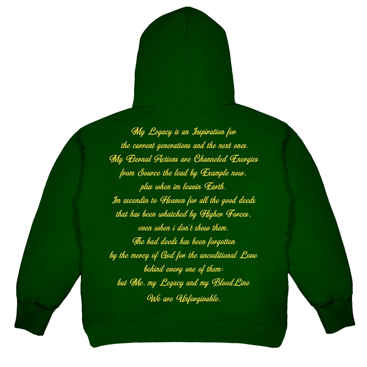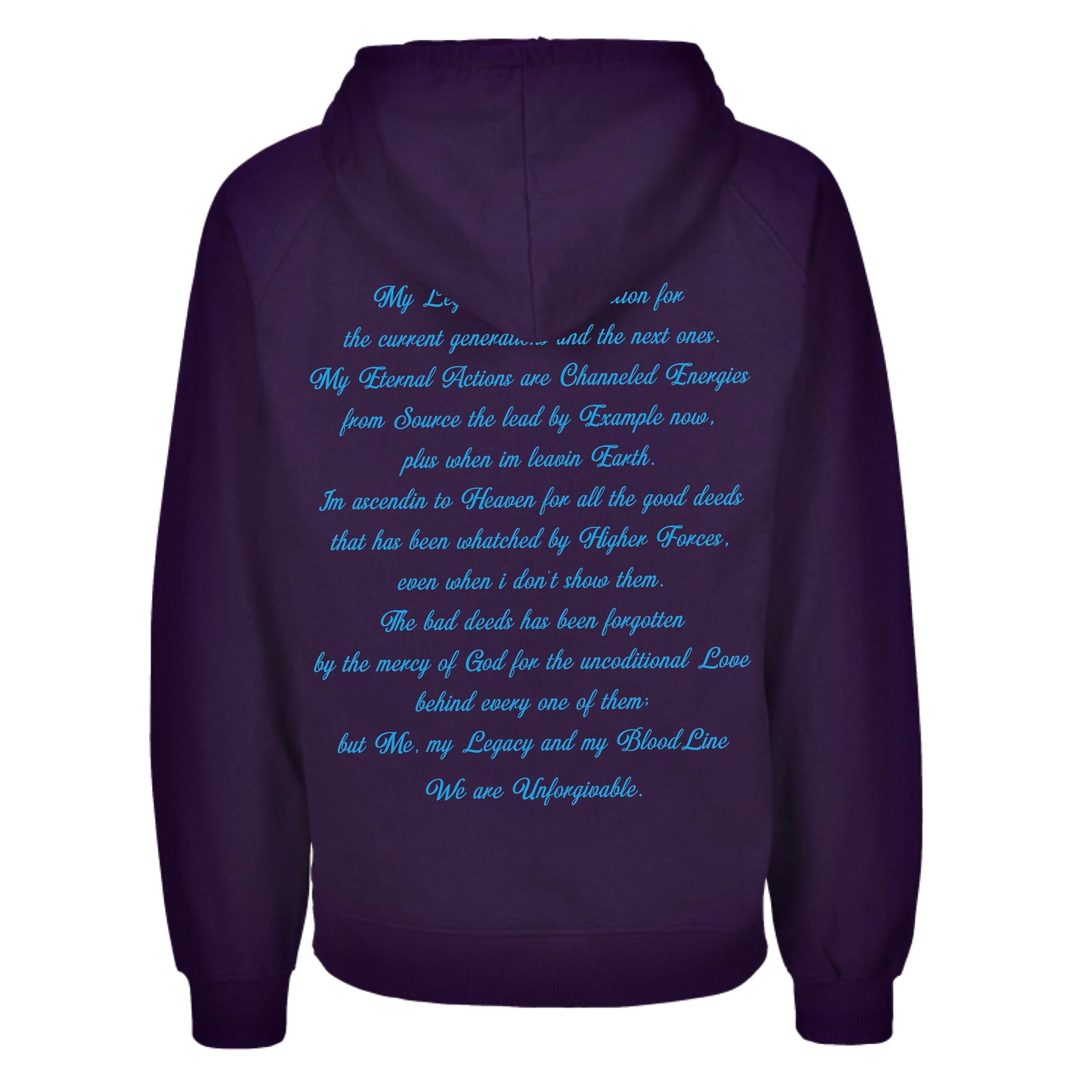 Affirmation, Prayer on the Back : My Legacy is an Inspiration for the current Generations and the Next Ones. My Eternal Actions are Channeled Energies from Source that Lead by Example now, plus when im leavin Earth. Im ascendin to Heaven for all the good Deeds that has been whatched by Higher Forces, even when i don't show them. The bad deeds has been forgotten by the mercy of God for the Uncoditional Love behind every one of them; but Me, my Legacy and my BloodLine We are Unforgivable.