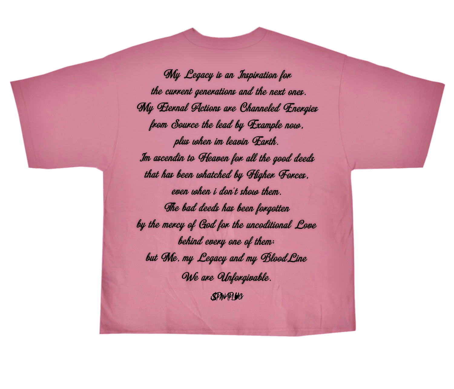 Affirmation, Prayer on the Back :Ā My Legacy is an Inspiration for the current Generations and the Next Ones. My Eternal Actions are Channeled Energies from Source that Lead by Example now, plus when im leavin Earth. Im ascendin to Heaven for all the good Deeds that has been whatched by Higher Forces, even when i don't show them. The bad deeds has been forgotten by the mercy of God for the Uncoditional Love behind every one of them; but Me, my Legacy and my BloodLine We are Unforgivable.