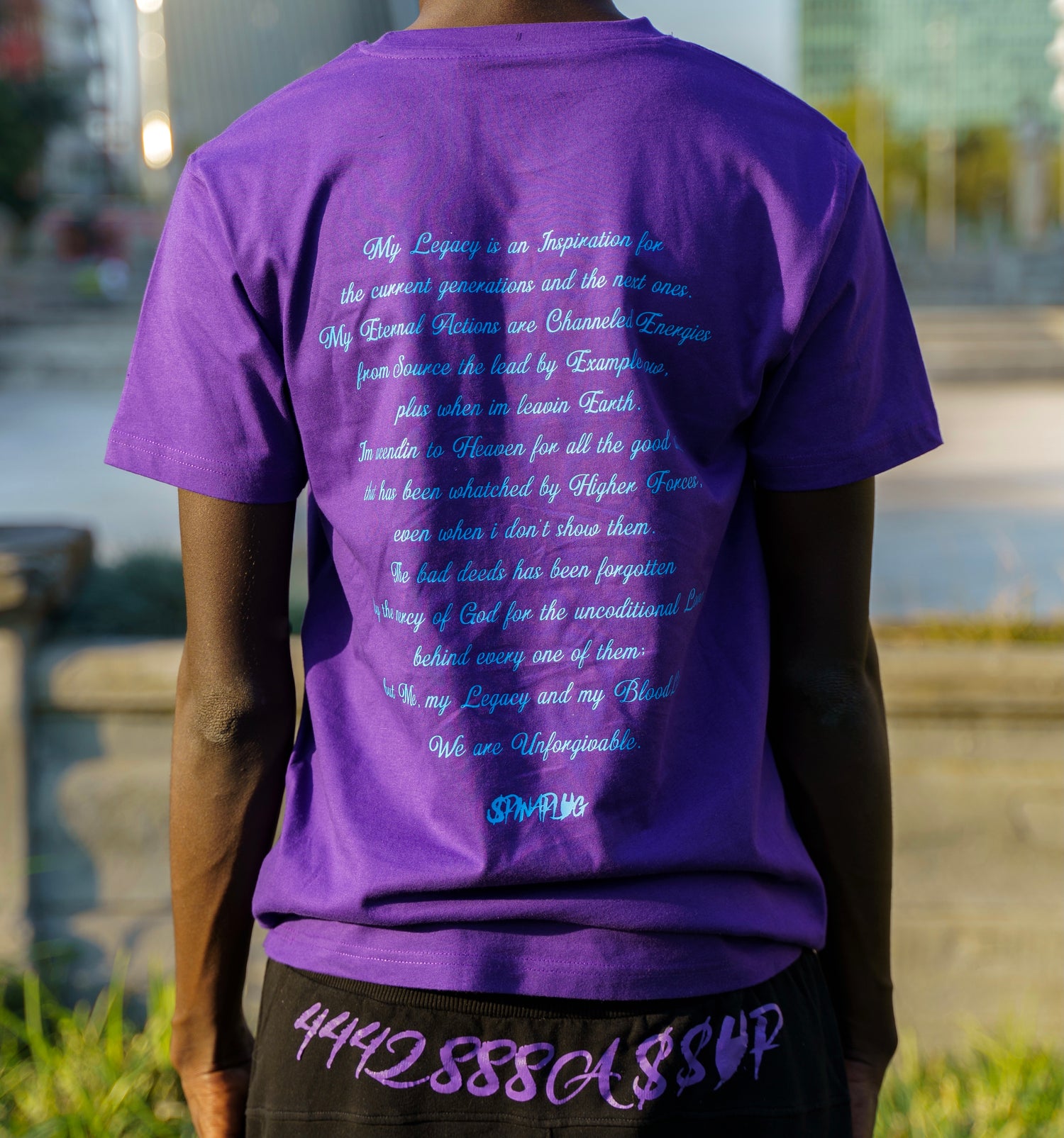 T-Shirt Affirmation, Prayer on the BackĀ My Legacy is an Inspiration for the current Generations and the Next Ones. My Eternal Actions are Channeled Energies from Source that Lead by Example now, plus when im leavin Earth. Im ascendin to Heaven for all the good Deeds that has been whatched by Higher Forces, even when i don't show them. The bad deeds has been forgotten by the mercy of God for the Uncoditional Love behind every one of them; but Me, my Legacy and my BloodLine We are Unforgivable.